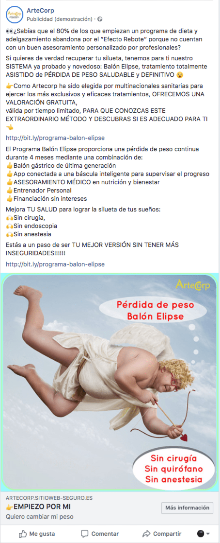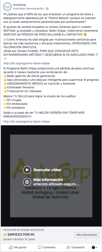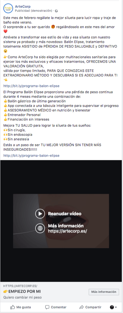 Campañas de Publicidad Online en redes sociales para centro médico ArteCorp. Fueron 3 conjuntos de anuncios. Por motivos de privacidad no está permitido mostrar los resultados. Finalmente, una persona compró el tratamiento del Balón Gástrico.